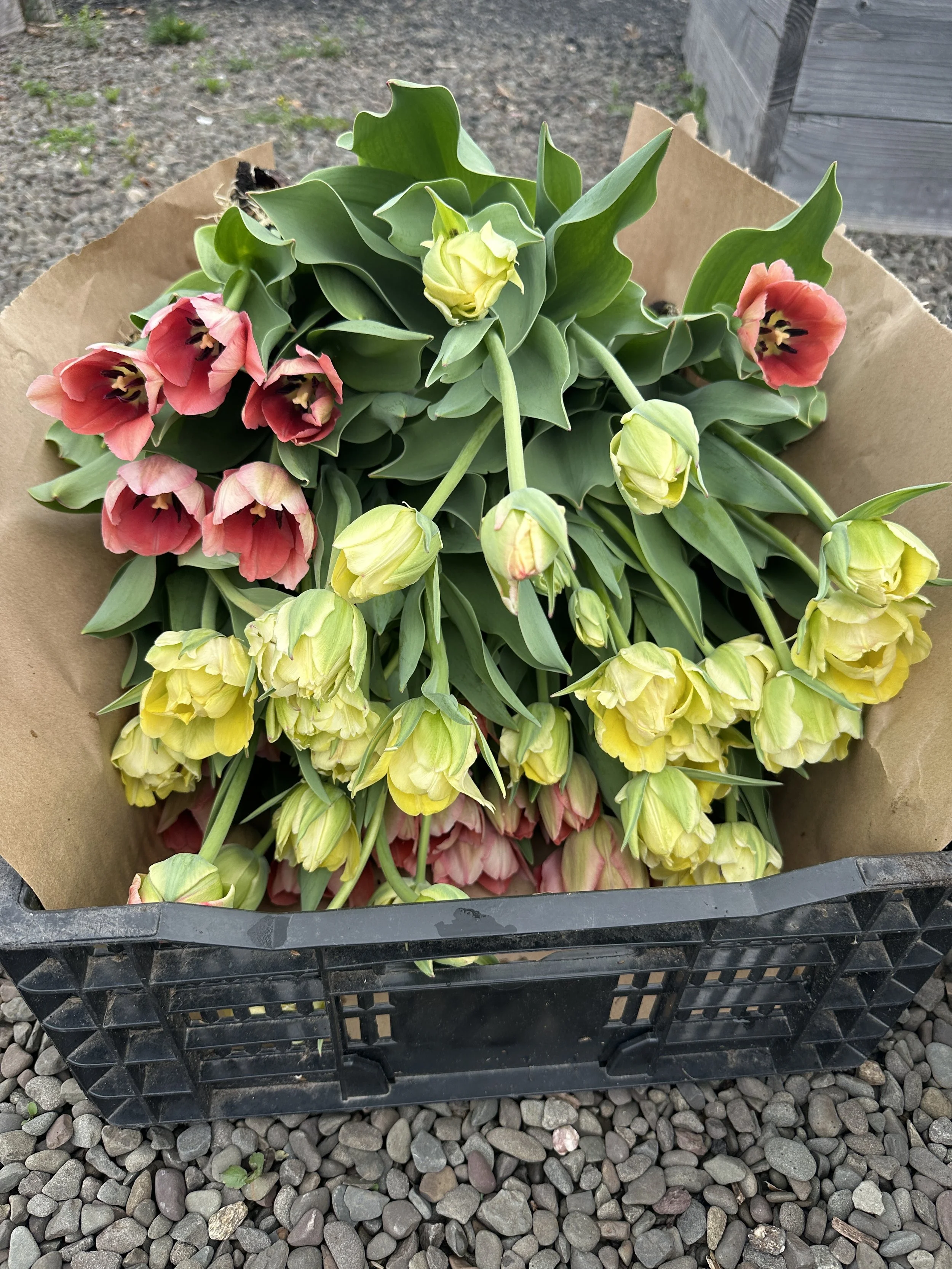 Farmer's choice on colors and stems - our seasonal flowers are grown at a small scale, so each bouquet is one of a kind. The color palette and flower selection may vary and not match photos. Bouquets will contain approximately 20–35 stems depending on the size and character of each flower.